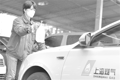 上海燃氣檢修人員對待命中的出勤車輛進行消毒。(企業供圖)
