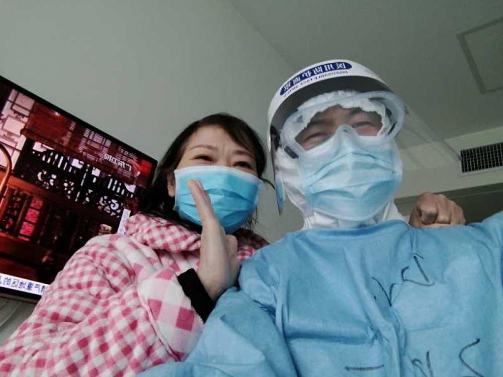 圖為北醫三院援湖北醫療隊劉慧強和患者在一起。