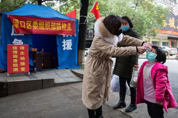 3月4日,在湖南省株洲市淥口區(qū)一住宅小區(qū)前的值守點,工作人員為居民測量體溫。新華社發(fā)陳思汗攝