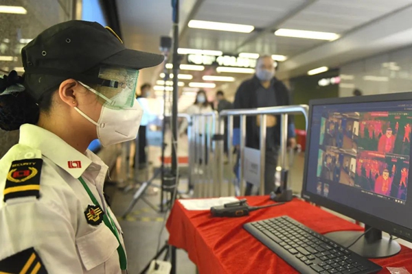 3月9日,在廣州地鐵海珠廣場站,工作人員通過紅外線體溫儀對進站乘客體溫進行監(jiān)測。新華社記者 盧漢欣 攝