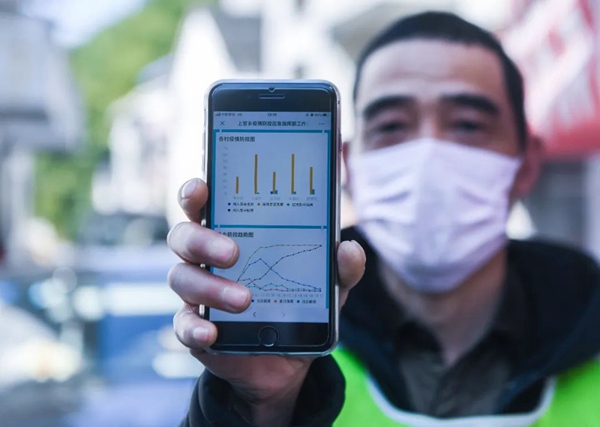 2月20日,在浙江省杭州市富陽區(qū)上官鄉(xiāng)芳村檢查點,工作人員展示手機上的“疫情防控云圖”的實時數(shù)據(jù)。新華社記者 徐昱 攝