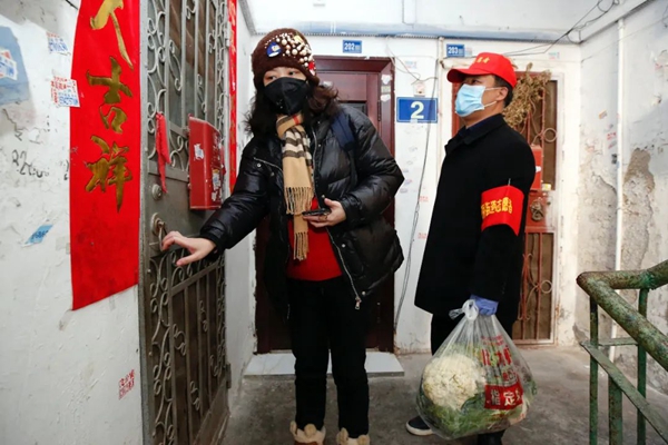 武漢市江岸區(qū)花橋社區(qū)志愿者蔣晨一(左)和下沉社區(qū)的干部謝文先來到一名獨居老人家為其送菜(2月20日攝)。新華社記者沈伯韓攝