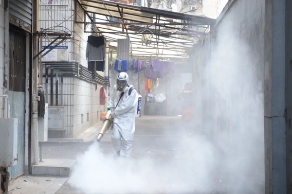 2月5日,長沙藍(lán)天救援隊隊員在長沙市馬王街社區(qū)內(nèi)消毒殺菌。新華社發(fā)(陳振海攝)