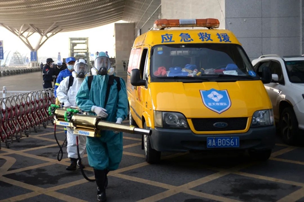 2月5日,長沙藍(lán)天救援隊隊員準(zhǔn)備進入長沙磁浮高鐵站消毒殺菌。新華社發(fā)(陳振海攝)