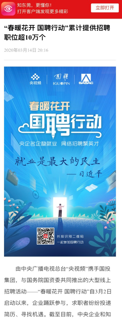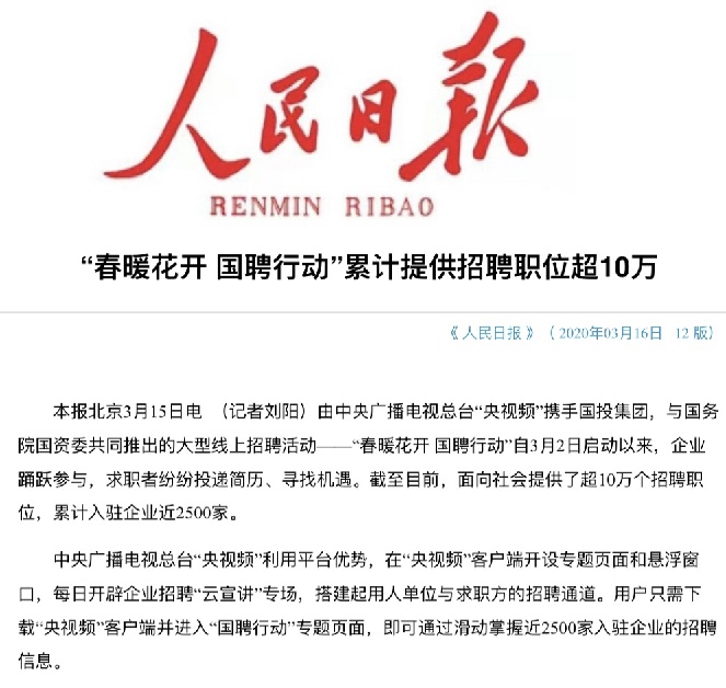 由中央廣播電視總臺“央視頻”攜手國投集團,與國務院國資委共同推出的大型線上招聘活動——“春暖花開 國聘行動”,自3月2日啟動以來,企業踴躍參與,求職者紛紛投遞簡歷。截至3月14日已面向社會提供了超10萬個招聘職位,累計入駐企業近2500家,引發眾多媒體和網站轉載報道。