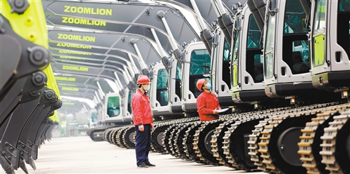 位于陜西省渭南高新區(qū)的中聯(lián)重科渭南工業(yè)園內(nèi),檢驗人員對即將出廠的挖掘機檢查驗收。崔正博攝(中經(jīng)視覺)