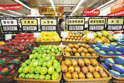 3月17日,居民在河北省邯鄲市永年區(qū)美食林超市選購蔬菜水果。 胡高雷攝(中經(jīng)視覺)