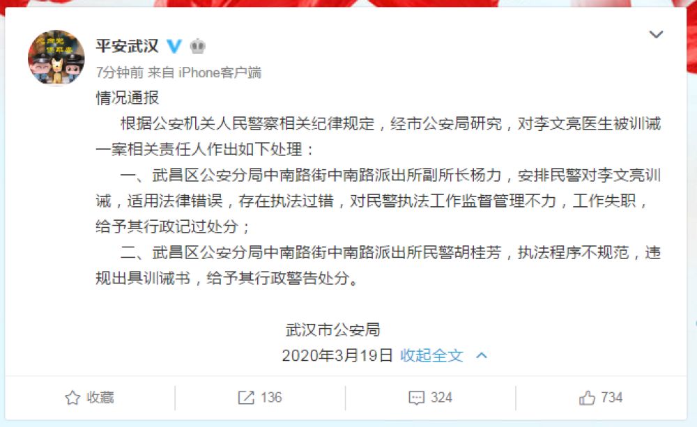 根據(jù)公安機關(guān)人民警察相關(guān)紀律規(guī)定,經(jīng)市公安局研究,對李文亮醫(yī)生被訓誡一案相關(guān)責任人作出如下處理: