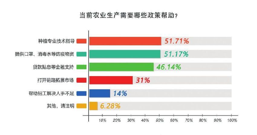 加強農(nóng)技指導(dǎo),給予金融支持。問卷調(diào)查中農(nóng)戶提出多項政策需求,51.71%的農(nóng)戶希望得到種植專業(yè)技術(shù)指導(dǎo),51.17%的農(nóng)戶呼吁提供口罩、消毒液等防疫物資,46.14%的農(nóng)戶則希望得到貸款貼息等金融扶持。(見圖4)