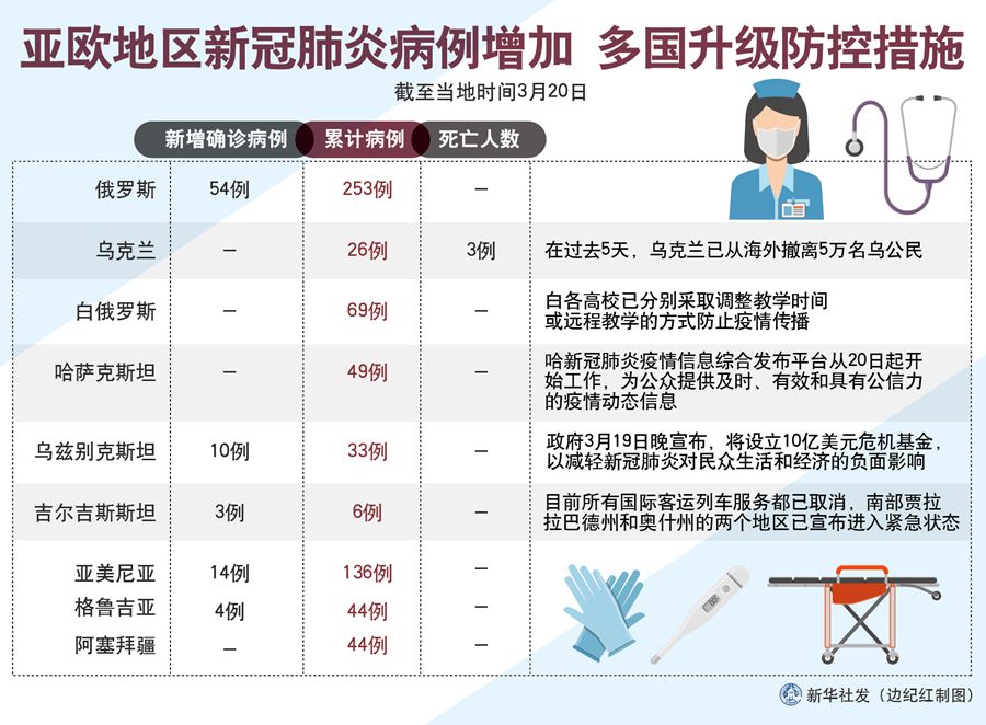 新華社莫斯科3月21日電 綜合新華社駐亞歐地區(qū)記者報(bào)道:亞歐地區(qū)新冠肺炎確診病例20日繼續(xù)增加,多國(guó)采取暫停客運(yùn)等防控措施。