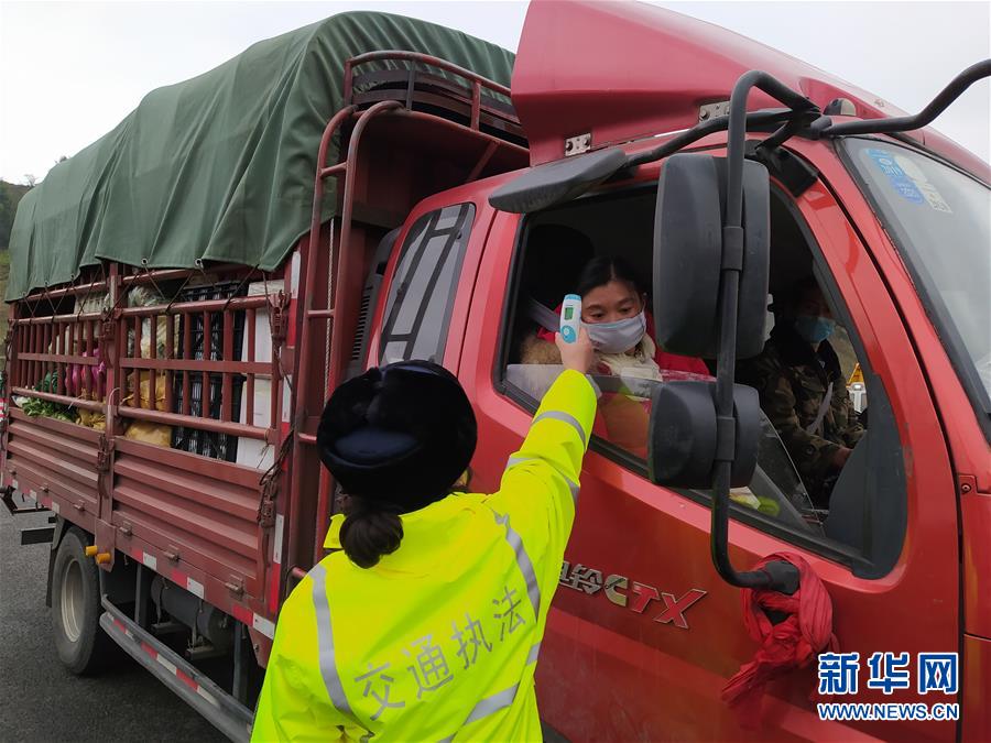 四川省交通運輸廳高速公路交通執法第五支隊雅康大隊隊長強薇在雅康高速公路上進行防疫檢查(2月1日攝)。 新華社發