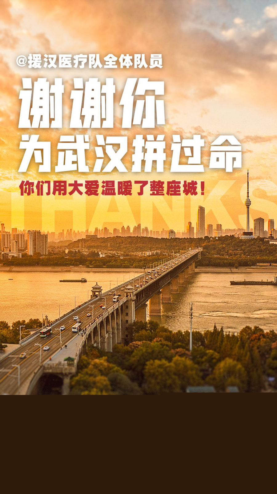 患難相扶,生死與共。在這幾十天里,你們與武漢人民心手相連、生死相依,從死神手中搶回了一條條生命、拯救了一個(gè)個(gè)家庭。忘不了你們從祖國(guó)四面八方馳援武漢時(shí),口中喊出的“武漢加油!中國(guó)加油!”;忘不了你們穿著防護(hù)裝備走進(jìn)病房,握著患者的手說(shuō)“別怕,有我們?cè)冢 保煌涣四銈兡樕媳幻嬲掷粘龅囊坏赖烙『郏桓涣四銈冋艨谡趾舐冻雒利惷匀说男θ荩 皼](méi)有生而英勇,只是選擇無(wú)畏”,感謝你們?cè)谖錆h人民遭遇疫情的困難時(shí)刻,迎難而上、沖鋒在前,以命搏命、舍命相助,用大愛(ài)溫暖了整座城!因?yàn)槟銈兊牡絹?lái),武漢更多患者得到了及時(shí)有效的救治;因?yàn)槟銈兊牡絹?lái),武漢才這么快地迎來(lái)了疫情防控斗爭(zhēng)的勝利曙光;因?yàn)槟銈兊牡絹?lái),武漢才有了今天的穩(wěn)定和安寧。你們是最大的功臣!是新時(shí)代最可愛(ài)的人!武漢人民永遠(yuǎn)銘記你們的恩情!