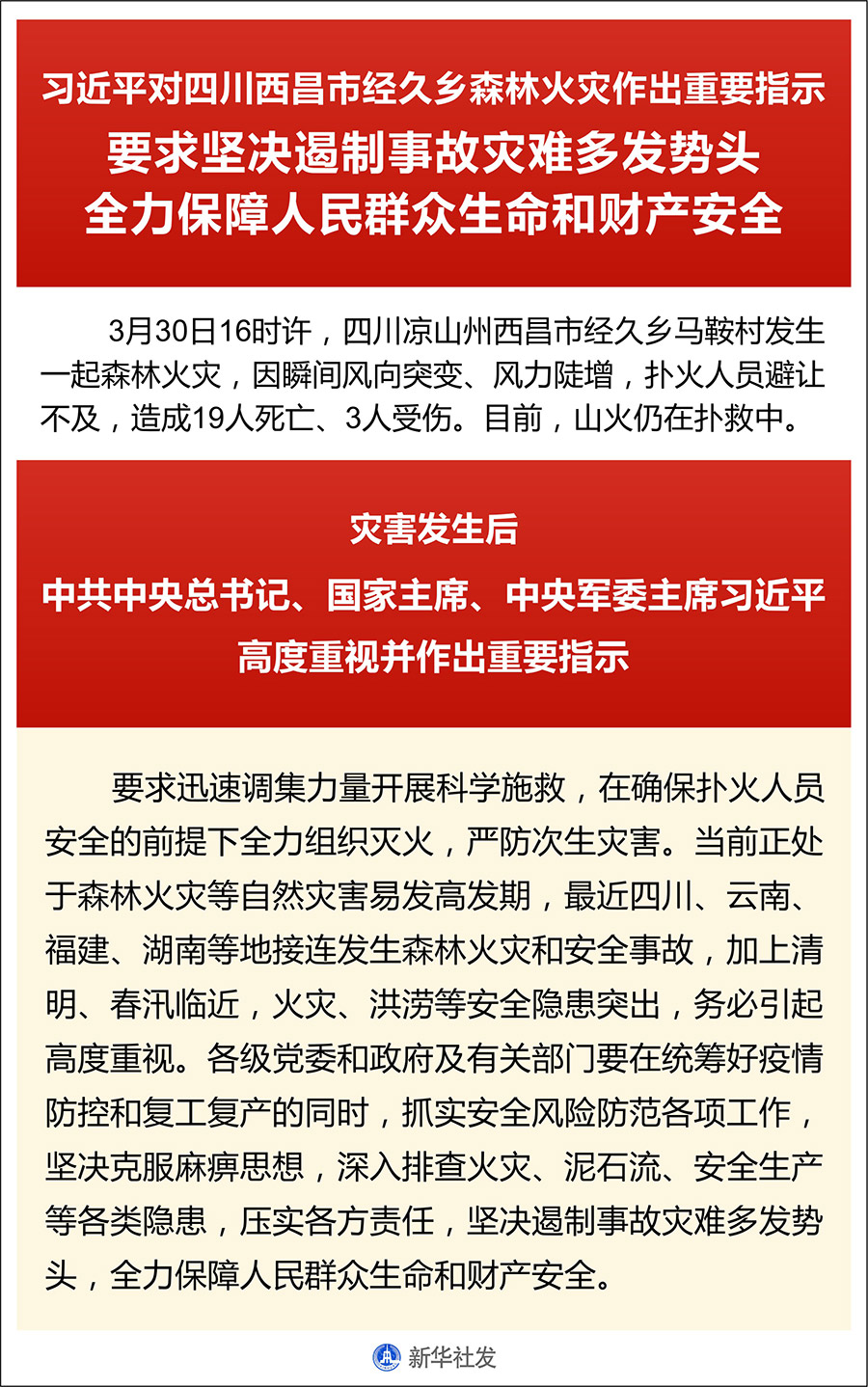 災害發(fā)生后,中共中央總書記、國家主席、中央軍委主席習近平高度重視并作出重要指示,要求迅速調(diào)集力量開展科學施救,在確保撲火人員安全的前提下全力組織滅火,嚴防次生災害。當前正處于森林火災等自然災害易發(fā)高發(fā)期,最近四川、云南、福建、湖南等地接連發(fā)生森林火災和安全事故,加上清明、春汛臨近,火災、洪澇等安全隱患突出,務必引起高度重視。各級黨委和政府及有關部門要在統(tǒng)籌好疫情防控和復工復產(chǎn)的同時,抓實安全風險防范各項工作,堅決克服麻痹思想,深入排查火災、泥石流、安全生產(chǎn)等各類隱患,壓實各方責任,堅決遏制事故災難多發(fā)勢頭,全力保障人民群眾生命和財產(chǎn)安全。
