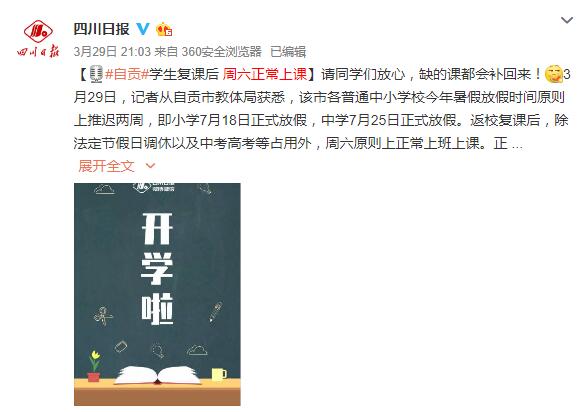 今年2月,四川就曾下發(fā)通知明確:中小學(xué)因延遲開學(xué)耽誤的教學(xué)時間,可通過調(diào)整周末和暑期等方式補(bǔ)齊。