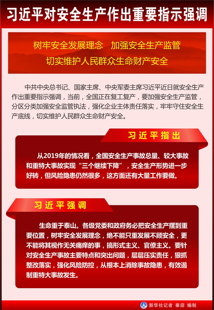 習(xí)近平強(qiáng)調(diào),生命重于泰山。各級黨委和政府務(wù)必把安全生產(chǎn)擺到重要位置,樹牢安全發(fā)展理念,絕不能只重發(fā)展不顧安全,更不能將其視作無關(guān)痛癢的事,搞形式主義、官僚主義。要針對安全生產(chǎn)事故主要特點(diǎn)和突出問題,層層壓實(shí)責(zé)任,狠抓整改落實(shí),強(qiáng)化風(fēng)險防控,從根本上消除事故隱患,有效遏制重特大事故發(fā)生。