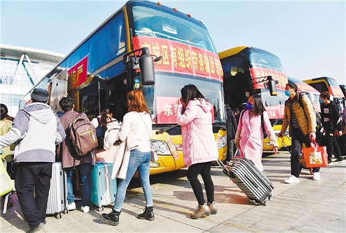 河南省南陽市宛城區組織務工人員乘坐大巴返崗。 陳 瓊攝