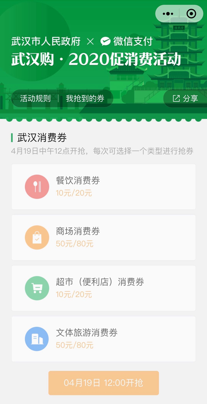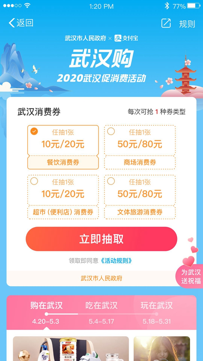 根據(jù)安排,“武漢消費(fèi)券”將在阿里巴巴、美團(tuán)點(diǎn)評(píng)、騰訊等3家企業(yè)自有線上平臺(tái)上按周投放,總體投放分兩期執(zhí)行。其中,第一期為4月19日至5月31日,首次投放活動(dòng)將在4月19日中午12時(shí)進(jìn)行,在漢人員可登錄支付寶、美團(tuán)、大眾點(diǎn)評(píng)、微信等手機(jī)程序,搜索“武漢”“消費(fèi)券”等關(guān)鍵詞進(jìn)入活動(dòng)頁(yè)面參與領(lǐng)券。第二期為6月1日至7月31日,具體投放時(shí)間另行公布。