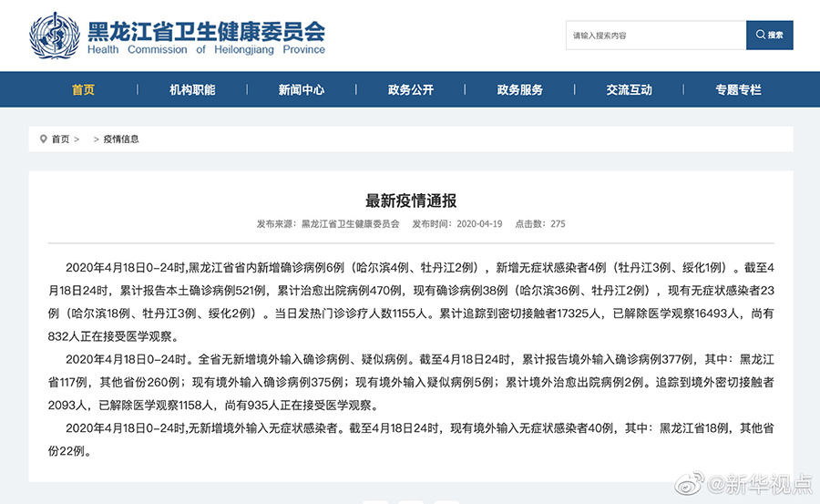 2020年4月18日0-24時,黑龍江省省內新增確診病例6例(哈爾濱4例、牡丹江2例),新增無癥狀感染者4例(牡丹江3例、綏化1例)。截至4月18日24時,累計報告本土確診病例521例,累計治愈出院病例470例,現有確診病例38例(哈爾濱36例、牡丹江2例),現有無癥狀感染者23例(哈爾濱18例、牡丹江3例、綏化2例)。當日發熱門診診療人數1155人。累計追蹤到密切接觸者17325人,已解除醫學觀察16493人,尚有832人正在接受醫學觀察。