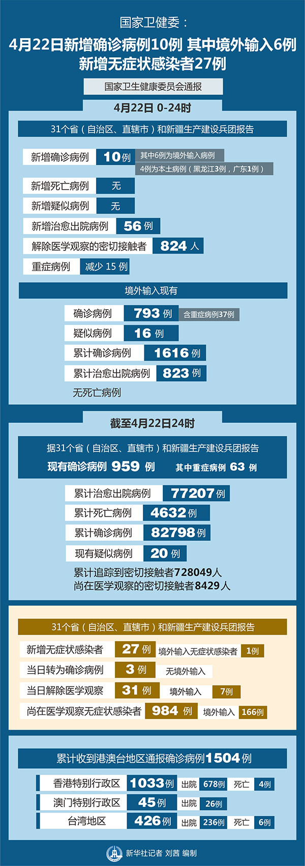 截至4月22日24時,據(jù)31個省(自治區(qū)、直轄市)和新疆生產(chǎn)建設(shè)兵團(tuán)報告,現(xiàn)有確診病例959例(其中重癥病例63例),累計(jì)治愈出院病例77207例,累計(jì)死亡病例4632例,累計(jì)報告確診病例82798例,現(xiàn)有疑似病例20例。累計(jì)追蹤到密切接觸者728049人,尚在醫(yī)學(xué)觀察的密切接觸者8429人。