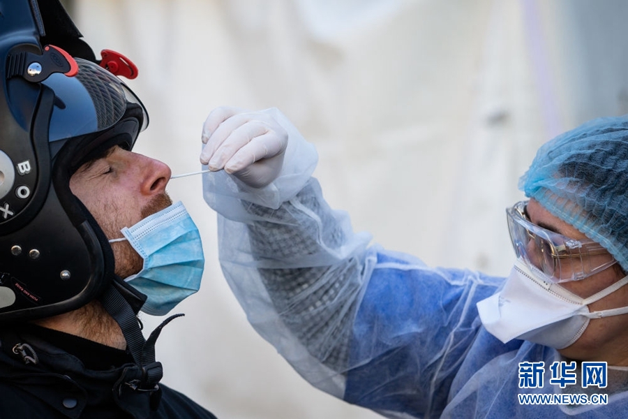 4月1日,在法國巴黎17區,工作人員為一名接受新冠病毒檢測的醫護人員取樣。新華社發(奧雷利安·莫里薩爾攝)