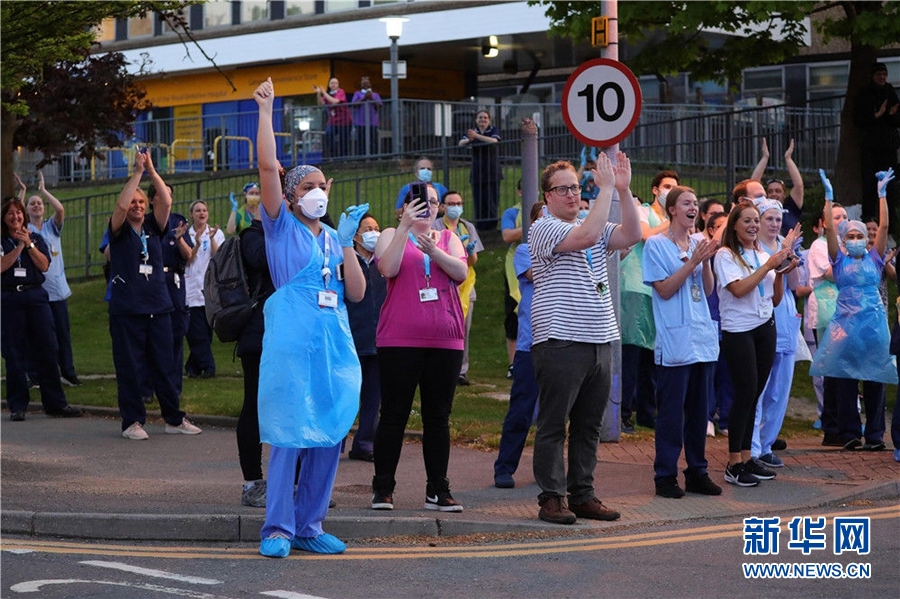 4月23日,在英國雷丁,皇家伯克郡醫院的醫護人員在醫院外鼓掌。新冠疫情暴發以來,每周四晚八時,英國人在陽臺、門前或窗前鼓掌,向醫護人員致敬。部分醫院的醫護人員也忙里偷閑走出醫院,感謝人們的支持,也為自己鼓掌加油。新華社發(蒂姆·愛爾蘭攝)