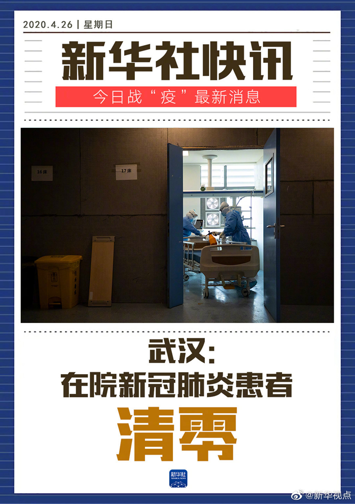 當(dāng)日下午在北京舉行的國(guó)務(wù)院聯(lián)防聯(lián)控機(jī)制新聞發(fā)布會(huì)上,國(guó)家衛(wèi)生健康委新聞發(fā)言人米鋒也介紹說,經(jīng)過武漢和全國(guó)援鄂醫(yī)務(wù)人員的共同努力,至26日,武漢在院新冠肺炎患者清零。