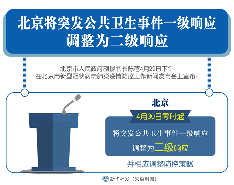 新華社北京4月29日電(記者關桂峰)北京市人民政府副秘書長陳蓓29日下午在北京市新型冠狀病毒肺炎疫情防控工作新聞發布會上宣布:4月30日零時起,北京將突發公共衛生事件一級響應調整為二級響應,并相應調整防控策略。
