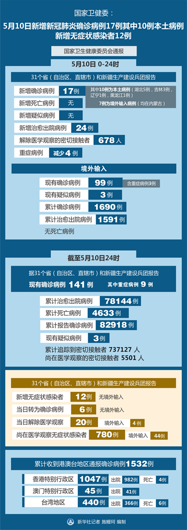 新華社北京5月11日電(記者屈婷)國家衛生健康委員會11日通報,5月10日0-24時,31個省(自治區、直轄市)和新疆生產建設兵團報告新增新冠肺炎確診病例17例,其中10例為本土病例(湖北5例,吉林3例,遼寧1例,黑龍江1例),7例為境外輸入病例(均在內蒙古);無新增死亡病例;無新增疑似病例。