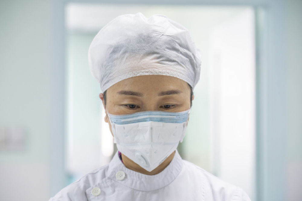 4月4日,在武漢大學中南醫院住院部,醫護人員在默哀 才楊/攝