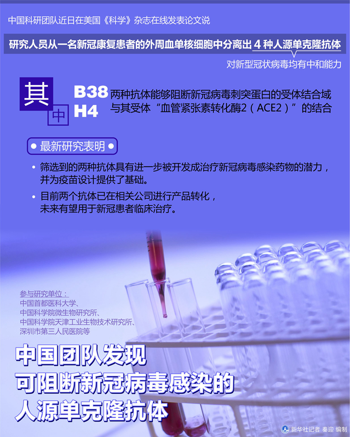 中國首都醫科大學、中國科學院微生物研究所、中國科學院天津工業生物技術研究所、深圳市第三人民醫院等多家單位參與這項研究。研究人員從一名新冠康復患者的外周血單核細胞中分離出4種人源單克隆抗體。實驗顯示,這4種抗體對新型冠狀病毒均有中和能力。其中,分別被稱為B38和H4的兩種抗體能夠阻斷新冠病毒刺突蛋白的受體結合域與其受體“血管緊張素轉化酶2(ACE2)”的結合。