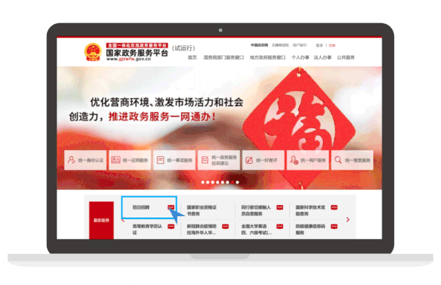 你可以通過電腦使用網(wǎng)頁搜索找到“國家政務(wù)服務(wù)平臺”后,首頁點擊“百日招聘”進入訪問,也可以點擊下方圖片直達“百日招聘”專題。