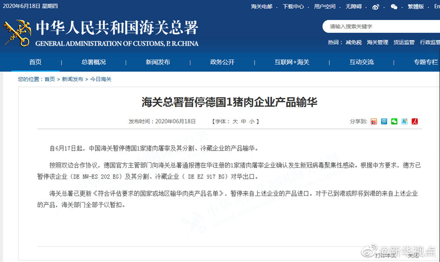 海關(guān)總署18日發(fā)布公告,自6月17日起,中國(guó)海關(guān)暫停德國(guó)一家豬肉屠宰及其分割、冷藏企業(yè)的產(chǎn)品輸華。按照雙邊合作協(xié)議,德國(guó)官方主管部門(mén)向海關(guān)總署通報(bào)德在華注冊(cè)的一家豬肉屠宰企業(yè)確認(rèn)發(fā)生新冠病毒聚集性感染。根據(jù)中方要求,德方已暫停該企業(yè)及其分割、冷藏企業(yè)對(duì)華出口。海關(guān)總署已更新《符合評(píng)估要求的國(guó)家或地區(qū)輸華肉類(lèi)產(chǎn)品名單》,暫停來(lái)自上述企業(yè)的產(chǎn)品進(jìn)口。對(duì)于已到港或即將到港的來(lái)自上述企業(yè)的產(chǎn)品,海關(guān)部門(mén)全部予以暫扣。(記者劉紅霞)