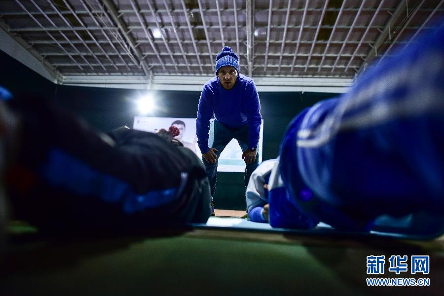 在青海省海東市互助土族自治縣的網(wǎng)球場內(nèi),喬西·羅賓遜帶領(lǐng)學(xué)員進(jìn)行拉伸運(yùn)動(2019年11月7日攝)。 新華社記者吳剛攝