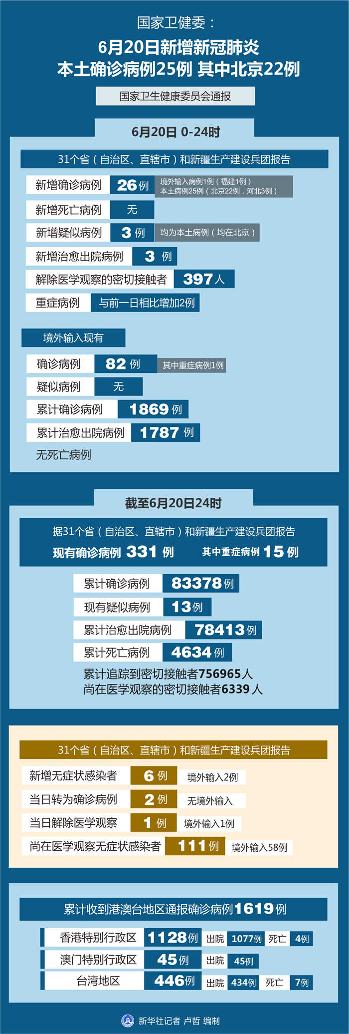 新華社北京6月21日電(記者陳聰)據(jù)國(guó)家衛(wèi)生健康委員會(huì)21日通報(bào),6月20日0—24時(shí),31個(gè)省(自治區(qū)、直轄市)和新疆生產(chǎn)建設(shè)兵團(tuán)報(bào)告新增新冠肺炎確診病例26例,其中境外輸入病例1例(在福建),本土病例25例(北京22例,河北3例);無(wú)新增死亡病例;新增疑似病例3例,均為本土病例(均在北京)。