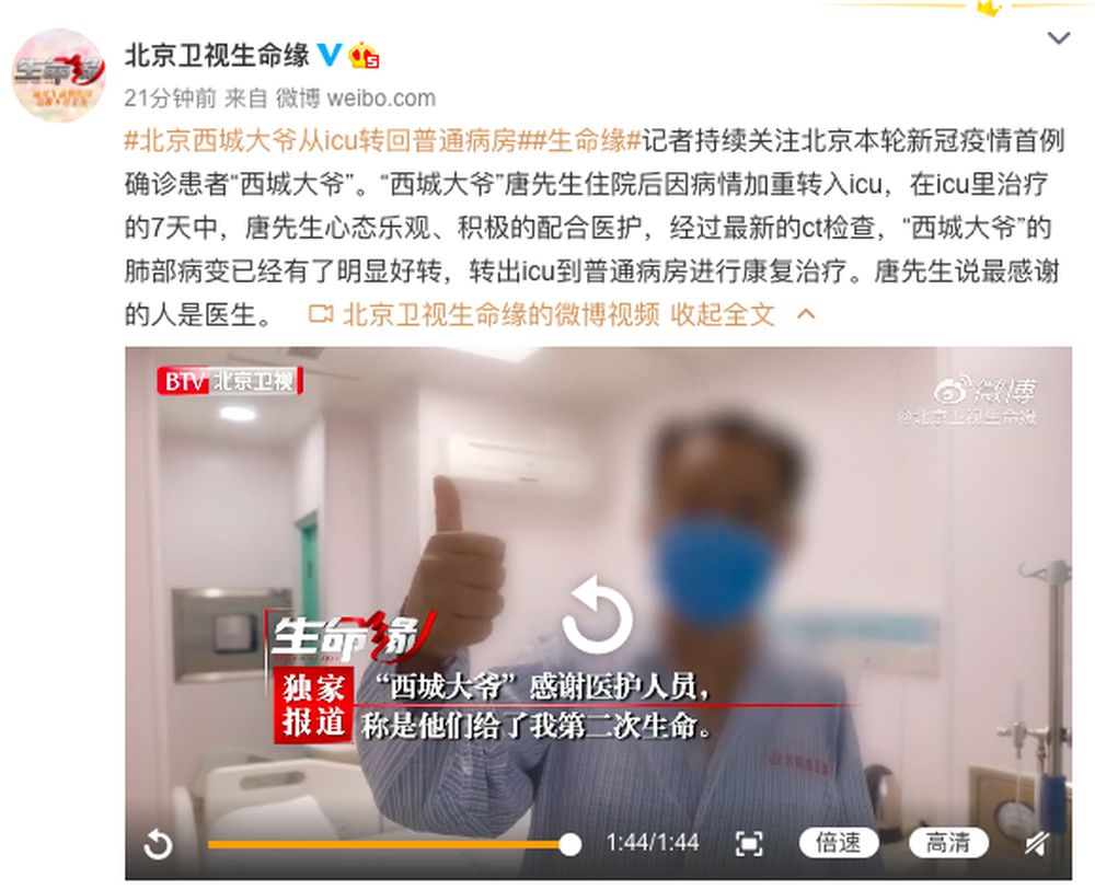 記者持續(xù)關(guān)注北京本輪新冠疫情首例確診患者“西城大爺”。“西城大爺”唐先生住院后因病情加重轉(zhuǎn)入ICU,在ICU治療的7天中,唐先生心態(tài)樂觀、積極配合醫(yī)護,經(jīng)過最新的CT檢查,“西城大爺”的肺部病變已經(jīng)有了明顯好轉(zhuǎn),轉(zhuǎn)出ICU到普通病房進行康復(fù)治療。唐先生說最感謝的人是醫(yī)生。