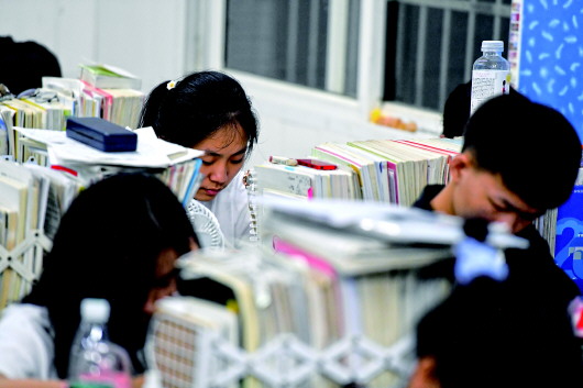 在湖南岳陽平江縣第二中學,向欣儀(中)在教室復習功課,備戰高考(7月3日攝)。記者陳澤國攝