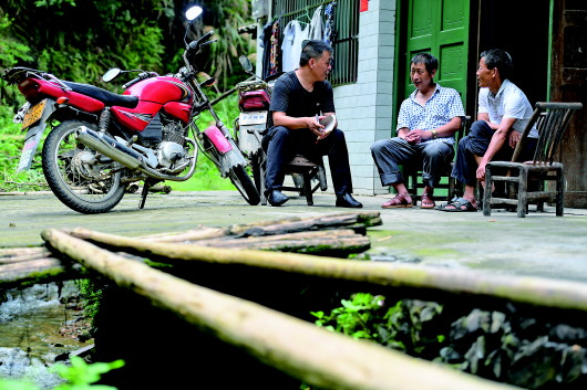在湖南岳陽平江縣大洲鄉上洲村,向彩旺(左)在貧困戶家中了解情況(7月3日攝)。記者陳澤國攝