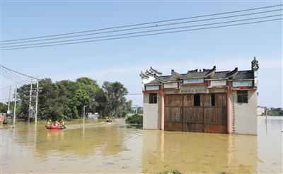 7月14日,江西省鄱陽縣龍口村下屬自然村藕塘村文化中心,洪災期間成為進出村內的碼頭。