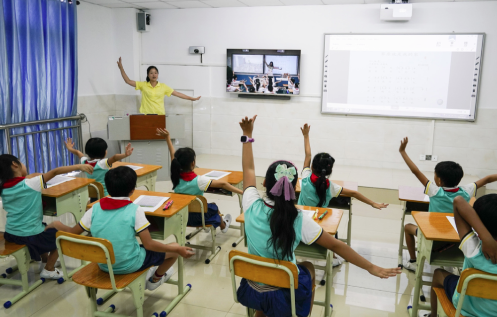 三沙市永興學校老師張利帶著學生,通過遠程在線教育系統,與海口市濱海第九小學的老師和學生一起上音樂課 (沈伯韓/攝)
