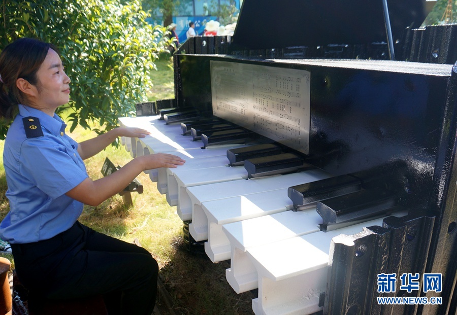 8月17日,向塘長軌基地的工作人員在彈奏一架由廢舊鋼軌制作成的鋼琴。新華網(wǎng)記者劉瓊 攝