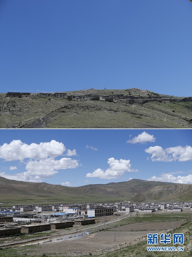 拼版照片:上圖是扎雜村山上的老房子;下圖是在山下建成的扎雜新村。新華網記者焦鵬 攝