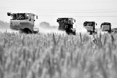 在山東省汶上縣郭倉鎮(zhèn),收割機(jī)在收獲小麥。新華社發(fā)