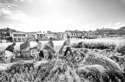 湖北省竹溪縣中峰鎮(zhèn)狄裕溝村農(nóng)民在金色貢米田園收割先成熟的稻谷。溫大樹攝/光明圖片
