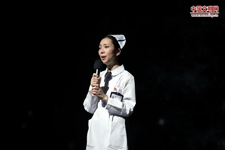 華東醫(yī)院外科重癥監(jiān)護室護士長、上海第一批援鄂醫(yī)療隊隊員陳貞現(xiàn)場講述“抗疫”故事。中國文明網(wǎng) 趙洋 攝