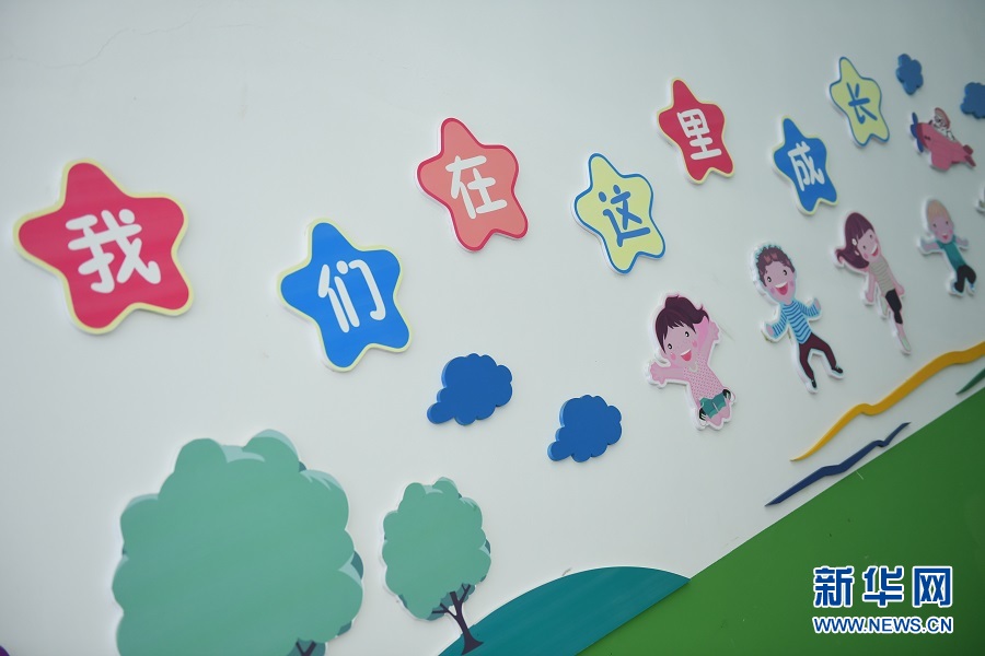 青海省果洛藏族自治州瑪沁縣拉加鎮中心幼兒園的文化展示墻。(新華網潘彬彬 攝)