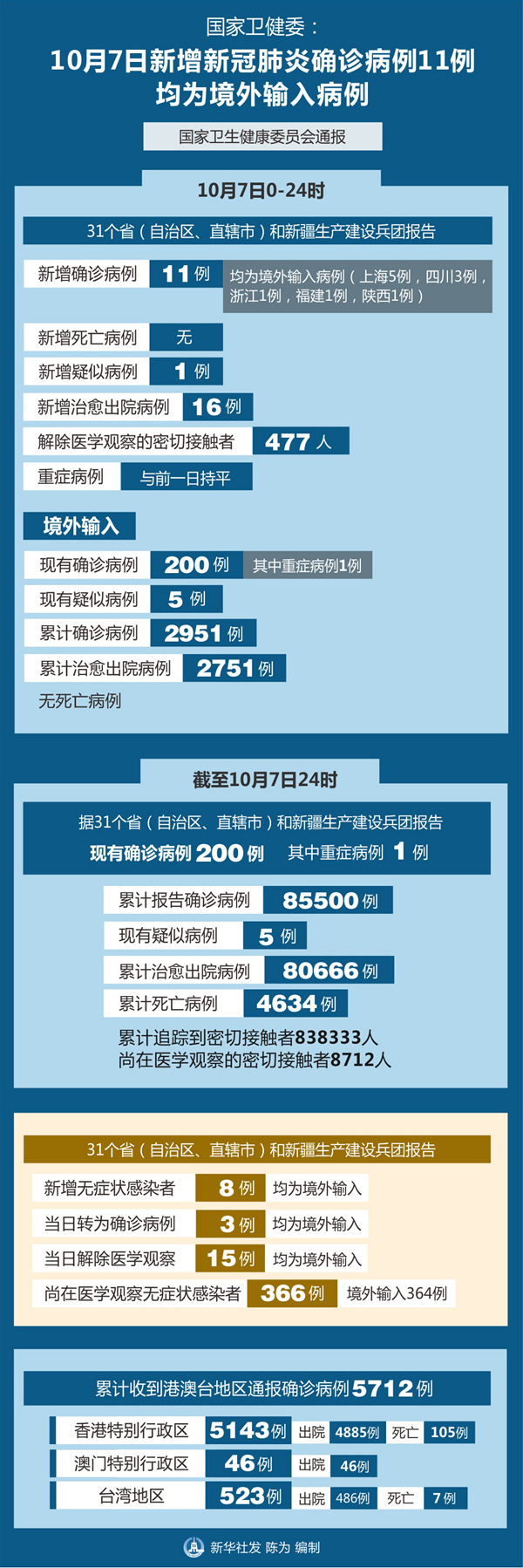 新華社北京10月8日電 國家衛健委8日通報,10月7日0-24時,31個省(自治區、直轄市)和新疆生產建設兵團報告新增新冠肺炎確診病例11例,均為境外輸入病例(上海5例,四川3例,浙江1例,福建1例,陜西1例);無新增死亡病例;新增疑似病例1例,為境外輸入病例(在上海)。