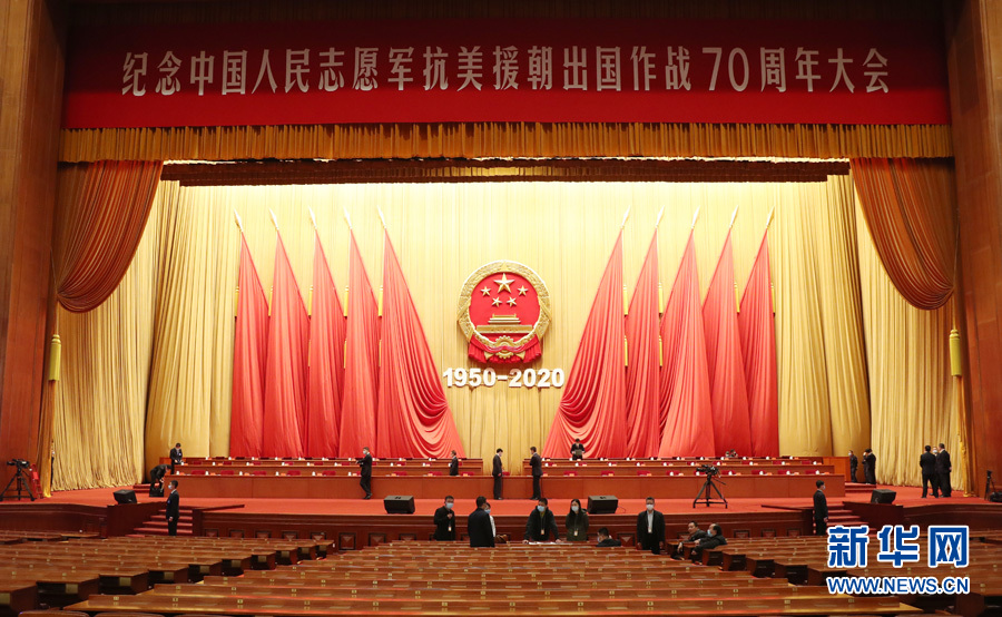 ??? 10月23日,紀(jì)念中國人民志愿軍抗美援朝出國作戰(zhàn)70周年大會(huì)在北京人民大會(huì)堂隆重舉行。圖為人民大會(huì)堂大禮堂。(新華網(wǎng) 翟子赫 攝)