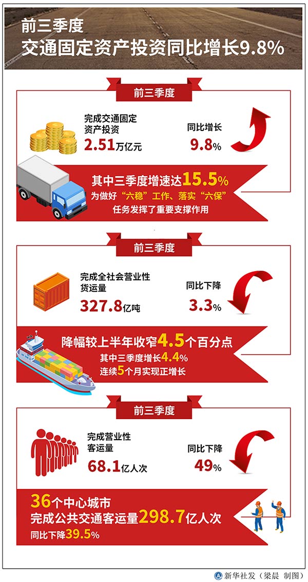 新華社北京10月28日電(記者魏玉坤)交通運(yùn)輸部新聞發(fā)言人、政策研究室主任吳春耕28日在國(guó)新辦發(fā)布會(huì)上表示,前三季度,完成交通固定資產(chǎn)投資2.51萬(wàn)億元,同比增長(zhǎng)9.8%,其中三季度增速達(dá)15.5%,為做好“六穩(wěn)”工作、落實(shí)“六保”任務(wù)發(fā)揮了重要支撐作用。