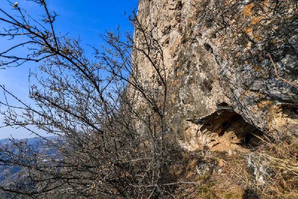 這次路程明顯縮短,但卻十分陡峭。有的路段,我們只能側著身子,石階僅容一只腳,兩只手只能扒著峭壁,而身后就是懸崖,有時需要雙腿跪著,慢慢挪動身體。由于沒吃、沒喝,嘴唇干裂起皮,開口說話也有點吃力。這樣攀爬一個多小時后,一個山洞進入我們的視野。