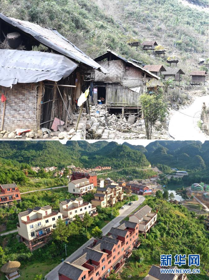 這是一張拼版照片。上圖:整屯搬遷前的廣西南丹縣里湖瑤族鄉董甲村么干屯(2018年1月10日攝)。這里的村民都搬遷到“千家瑤寨·萬戶瑤鄉”里湖王尚易地扶貧搬遷安置點。下圖:“千家瑤寨·萬戶瑤鄉”里湖王尚易地扶貧搬遷安置點(8月4日攝,無人機照片)。新華社記者 周華 攝